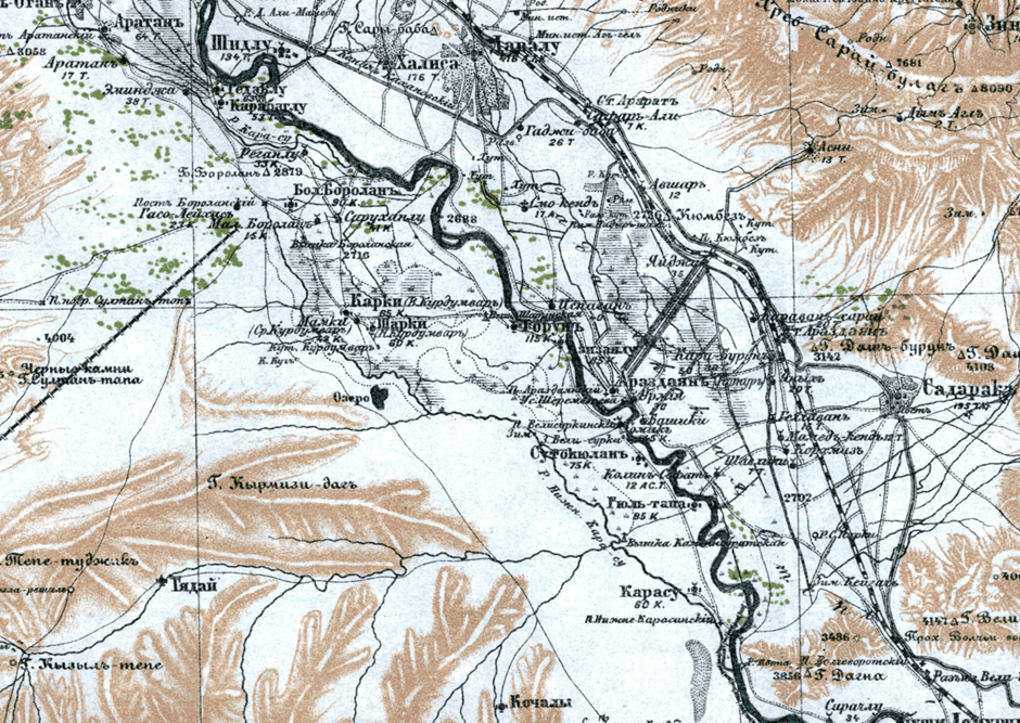 By 1873, Kurdish settlements in this area were still listed as winter pastures (зимовники). According to village registers of the Erivan Governorate and the Russian military’s five-verst map, this narrow strip of land hosted 11 villages populated by Muslims—10 Kurdish and 1 Turkic (Azerbaijani), the latter being Sarukhanlu.
