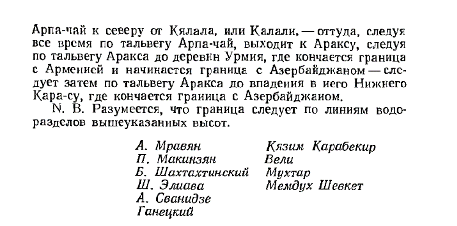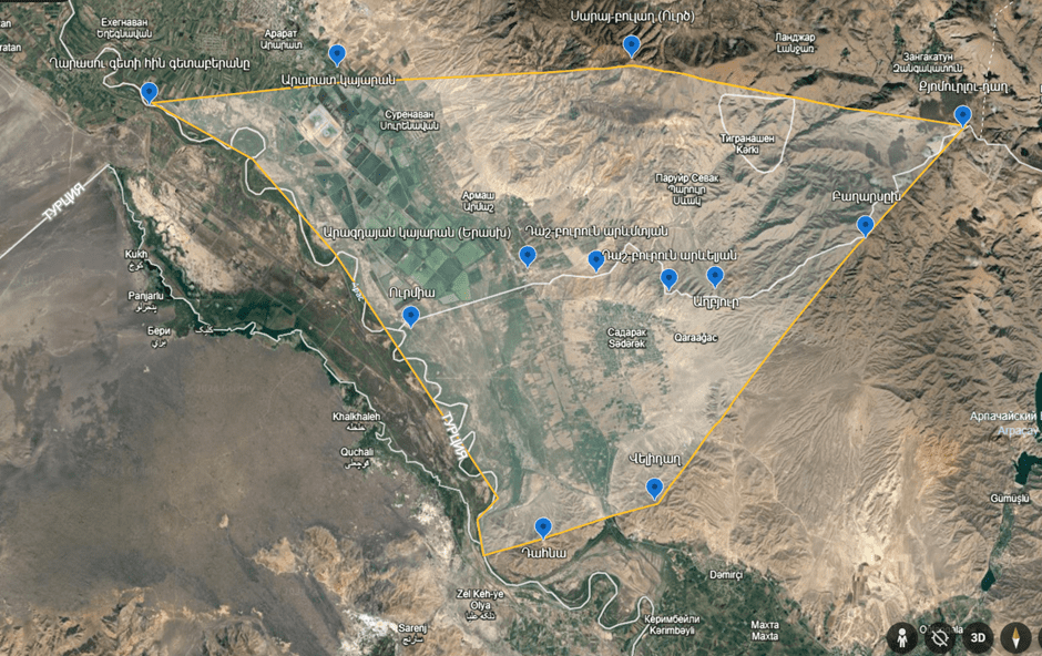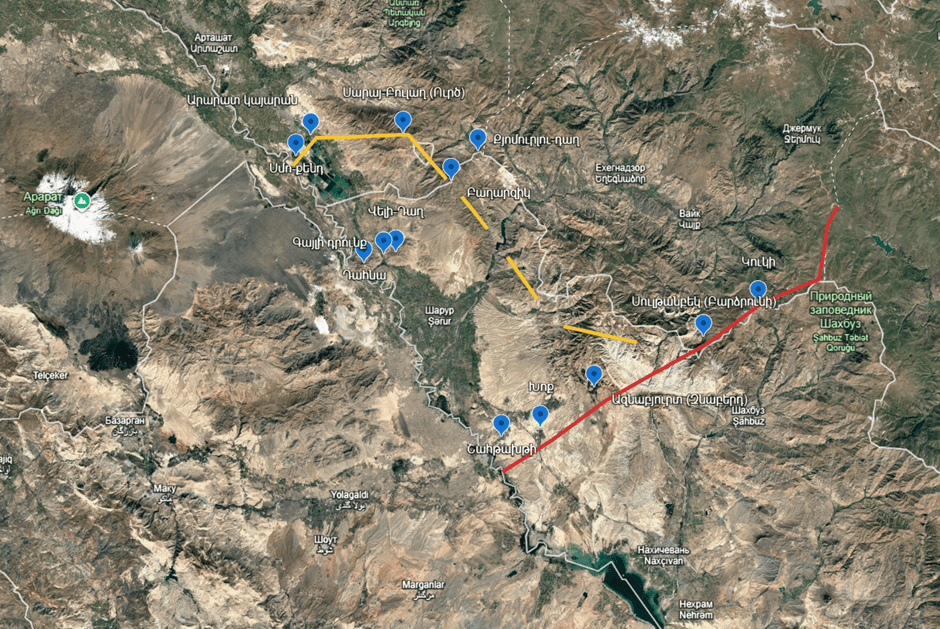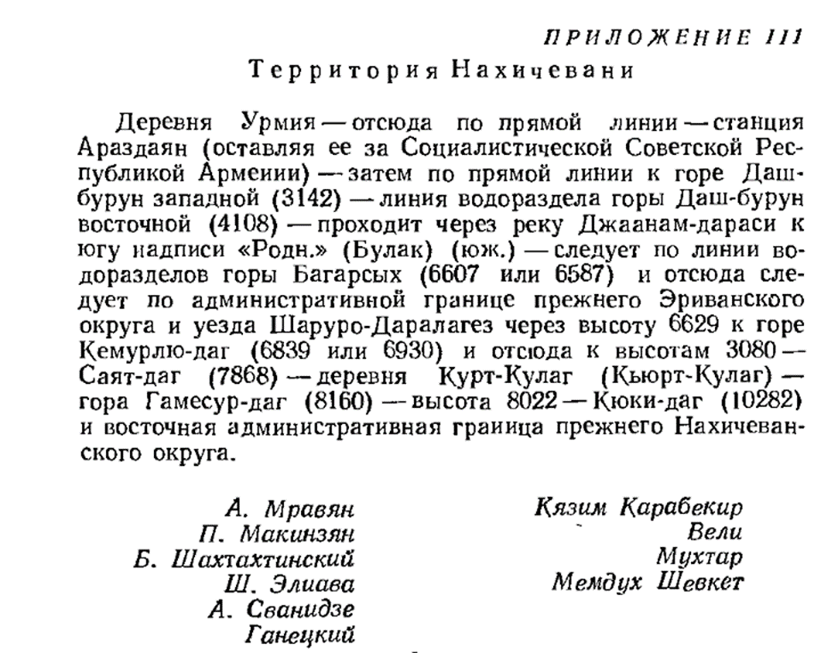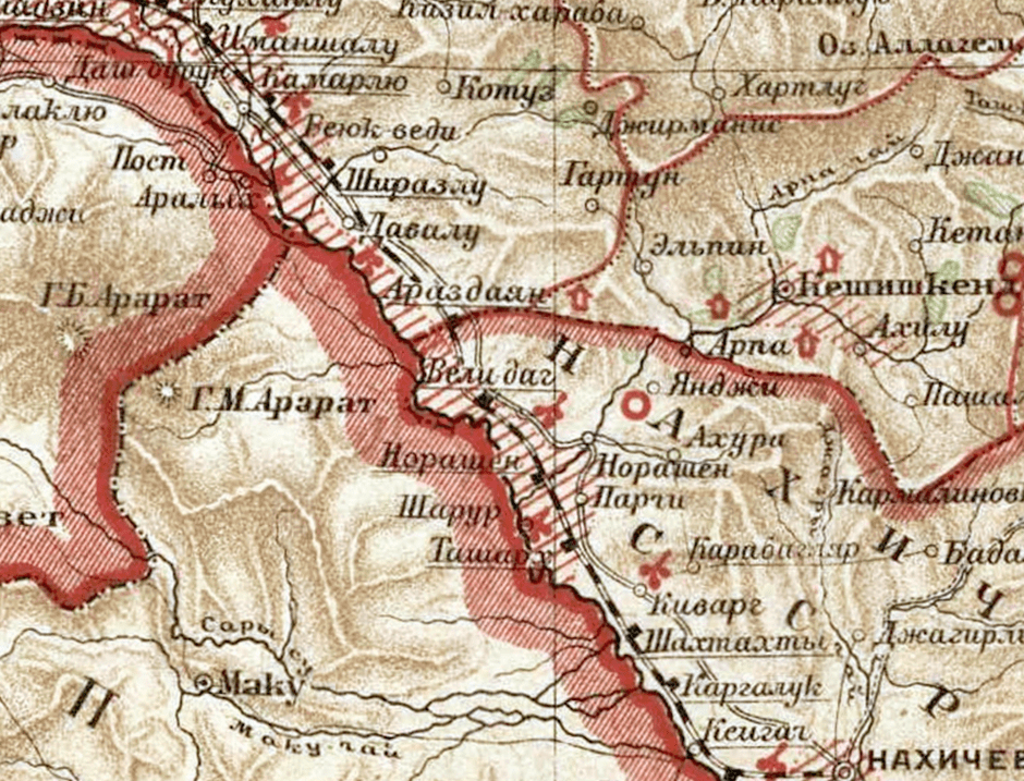 The Treaty of Moscow, signed on March 16, 1921, which transferred Nakhchivan to Azerbaijan, left Nakhchivan’s northern border undefined. Article 3 of the treaty stipulated that a commission composed of Turkish, Azerbaijani, and Armenian representatives would determine the boundary in the triangular area formed by the Dahna-Veli-Dagh-Bagharzik-Kyumurlu-Dagh-Saray-Bulag (Urz)-Ararat station line, the Aras River’s talweg (its deepest flow line), and the mouth of the Karasu River.