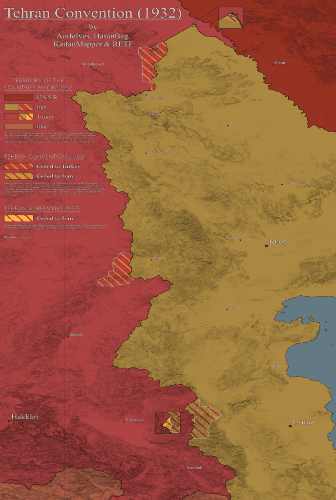On the other hand, the provision in the 1932 Tehran Convention between Turkey and Iran, which formalized territorial changes, including in the area of Little Ararat (where the borders of the Russian, Ottoman, and Persian empires intersected at the summit of Little Ararat until 1918, although most of the slopes belonged to Persia), has led to the conclusion that the section under discussion in the article refers to this area (see Map 7).