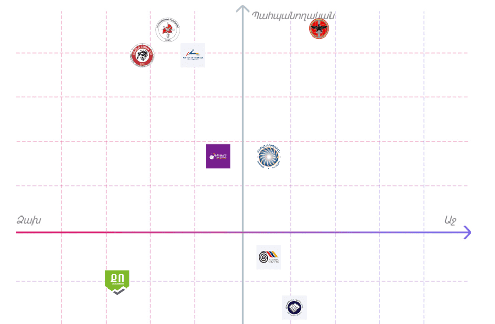 Այսպիսով, անցնելով հարցաշարը, հայ քաղաքական դաշտի մի շարք կուսակցություններ, պահպանողական/ազատական և ձախ/աջ փոփոխականներով, ըստ իրենց ծրագրերի բաշխվել են ներքոնշյալ կերպ (պատկեր 1)[vi]։ Կոմպասը նաև առաջարկում է փաստացի պատկեր, որի դեպքում կուսակցությունները պակաս պահպանողական են։ Սակայն, «փաստացի» հարթության չափման վերաբերյալ որևէ բացատրություն առկա չէ։