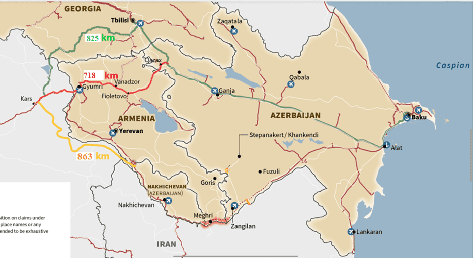 Հետևաբար, Հայաստանի հյուսիսով անցնող ճանապարհը հյուսիսային գծից կարճ է 107, իսկ Մեղրիով անցնող («Զանգեզուրի միջանցքի») գծից՝ 145 կմ-ով: