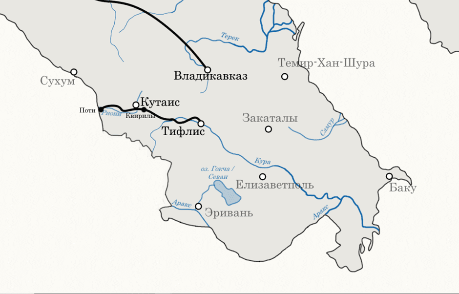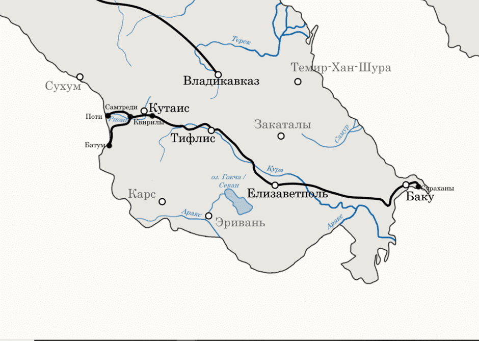 Քարտեզ 1․ Կովկասի տարածաշրջանի երկաթգծերը 1870-ականներին